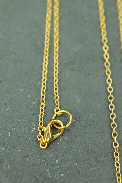 The electroformed labradorite pendant, roughly 20mm tall and 10mm wide, hangs on a gold plated chain.