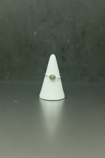 The labradorite stone measures approximately 5mm long, 5mm wide, and 4mm tall. Wear it alone for an elegant touch or stack it with others.