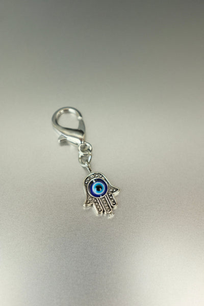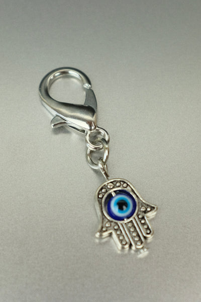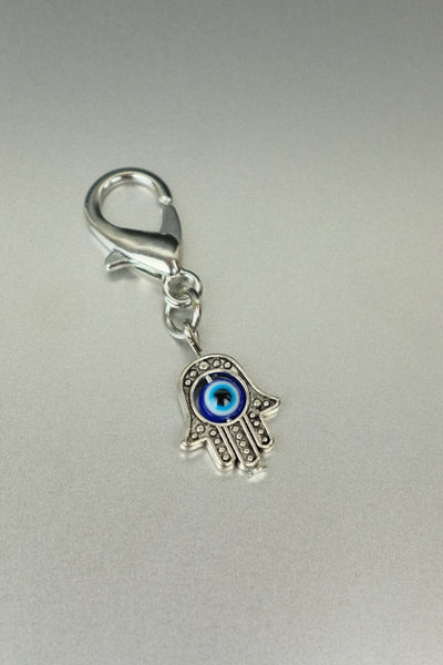 Carry layered protection with you, always. This silver Hamsa hand charm features a central evil eye motif – a double symbol of safety, strength and spiritual guarding. With a secure clip, it's made to attach easily to your bag, keys, purse or charm bar.